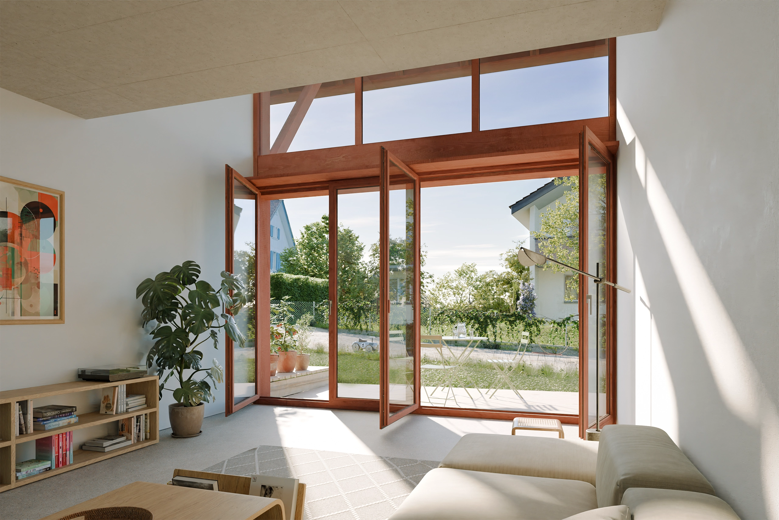 Rustikale Eleganz prägt die Häuser mit ihren tiefgezogenen, steilen Giebeldächern. Dank ein paar Zeilen Glasziegeln dringt eine Extraportion Sonne ins 2. Obergeschoss. Die Fassaden sind mit Holz verkleidet, durch die breiten und hohen Fensterflächen, ausgerichtet nach Südosten und Nordwesten, scheint das Licht von zwei Seiten ins neue Zuhause.