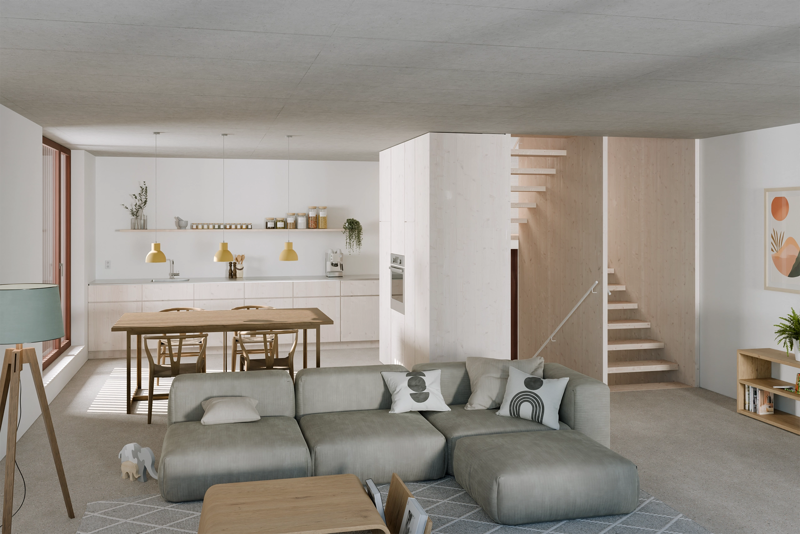 Ihr Haus betreten Sie von aussen im Erdgeschoss oder – mit Ausnahme des Hauses A6 – direkt und bequem über die Tiefgarage im Untergeschoss. Bei den Reihenhäusern unterteilt eine Wendeltreppe die kompakten Räume und verleiht ihnen unvergleichlichen Charme voller Stil und architektonischer Qualität. Der Luftraum mit Galerie im Obergeschoss prägt die Atmosphäre von Leichtigkeit im Wohn-Ess-Bereich.